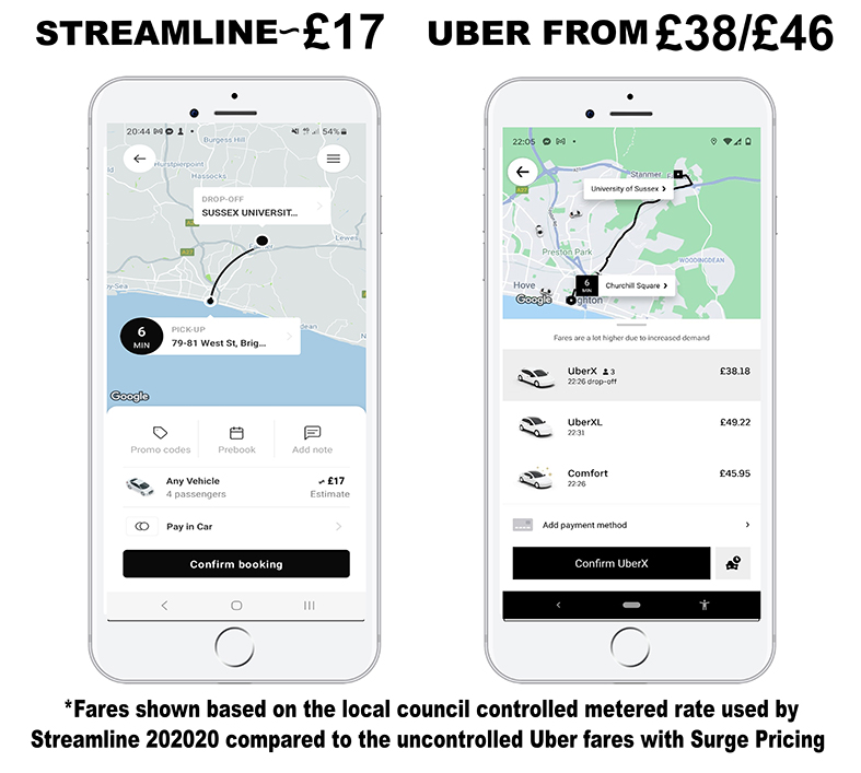 This is because Uber uses algorithms that raises the cost of the journey where as our local fares are strictly controlled by Brighton & Hove Council using sealed meters... so we don't charge extra when it rains!